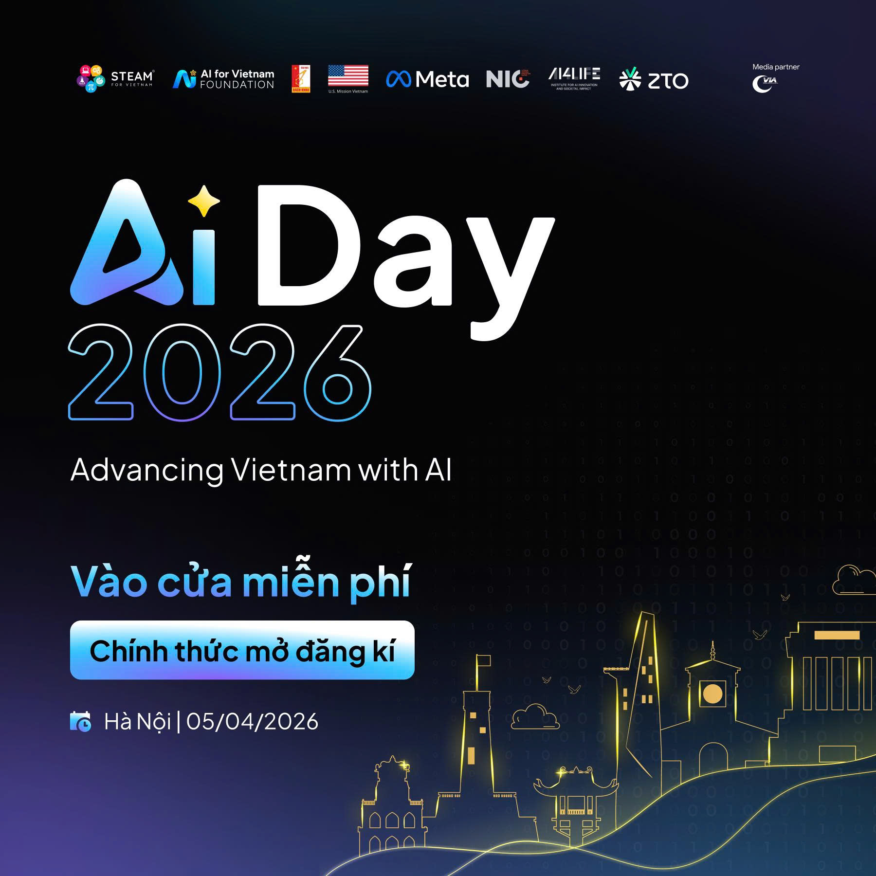 Được tổ chức bởi STEAM for Vietnam, AI for Vietnam, Đại sứ quán Hoa Kỳ, Đại học Bách Khoa Hà Nội, Meta, Trung tâm Đổi mới Sáng tạo Quốc gia (NIC), AI4LIFE và ZTO Labs, được hỗ trợ truyền thông bởi Hiệp hội Internet Việt Nam (VIA). AI Day 2026 là một không gian đối thoại mở, nơi các chuyên gia và nhà lãnh đạo cùng thảo luận về cách AI đang thay đổi cách con người học tập, làm việc và sáng tạo.
