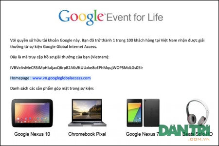 Trong tập tin đính kèm có nôi dung: “Với quyền sở hữu tài khoản Google này. Bạn đã trở thành 1 trong 100 khách hàng tại Việt Nam nhận được giải thưởng từ sự kiện Google Global Internet Access.”. Email này yêu cầu người dùng đăng nhập tài khoản cá nhân vào trang web: www.vn.googleglobalaccess.com và nhập mã xác nhận để trúng thưởng.