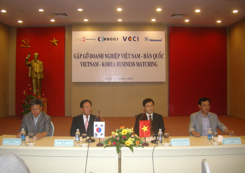 Từ ngày 26-31/10/2014, đoàn doanh nghiệp gồm 19 doanh nghiệp lớn của tỉnh Gimpo Hàn Quốc hoạt động trong lĩnh vực sản xuất và kinh doanh các sản phẩm như : dây cáp, thiết bị điện tử, thiết bị an ninh, dụng cụ đồ bếp, đồ gia dụng, mỹ phẩm, bao bì, thủy sản, thực phẩm, đèn Led, thang máy, máy lọc khí…sẽ sang thăm và làm việc tại Việt Nam. Nhân dịp này, Phòng Thương mại và Công nghiệp Hàn Quốc (KCCI) phối hợp cùng với Phòng Thương mại và Công nghiệp Việt Nam (VCCI) cùng Hiệp hội doanh nghiệp vừa và nhỏ thành phố Hà Nội tổ chức buổi Gặp gỡ doanh nghiệp Việt Nam – Hàn Quốc .